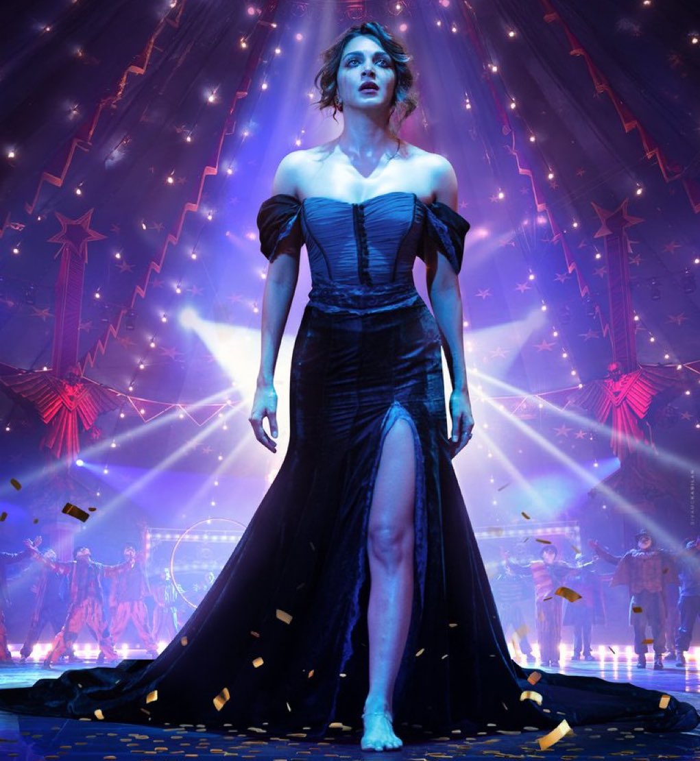 Okay, picture Kiara walking onto this wild circus stage like she owns it—bright lights, performers in the back, the whole vibe screaming glamour with a dark twist. She's in this sleek party gown, makeup a bit messy like she's just come out of some intense scene,and those eyes? Man, they're staring right at you with grief, power, and something unspoken. It's not your everyday pretty poster; it's got that "fairy tale gone wrong" energy the movie's all about. Set in a retro Goa drug cartel world, Nadia looks like she's hiding secrets, maybe betrayal or revenge. Fans are calling it "vampire queen vibes" or even comparing her to Harley Quinn—fierce and unapologetic. Director Geetu Mohandas said it redefines Kiara as an artist, and after seeing it, I get why.