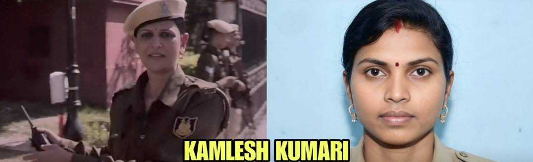 Right (Real): Kamlesh Kumari. A constable with the CRPF (Central Reserve Police Force). On December 13, 2001, she was posted at Iron Gate No. 1 of the Parliament House. She spotted the terrorists' car and ran towards it shouting an alarm, despite being unarmed. She was shot 11 times and died on the spot. She was posthumously awarded the Ashok Chakra, India's highest peacetime gallantry award.