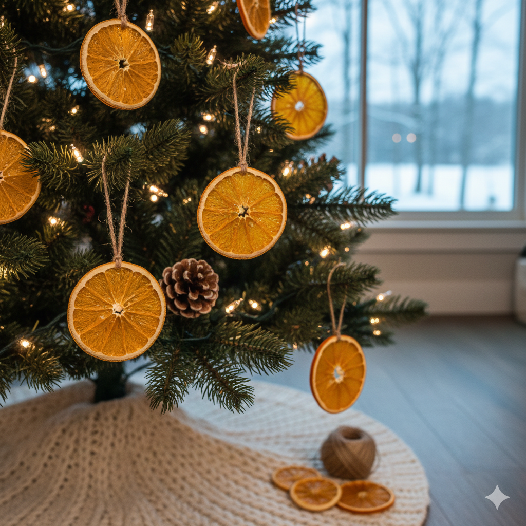 Thinly slice oranges, lemons, or grapefruit. Bake them on low heat (around 200F / 90C) for 3-4 hours until dry and translucent. They look like stained glass, smell amazing, and cost pennies. Thread with twine!